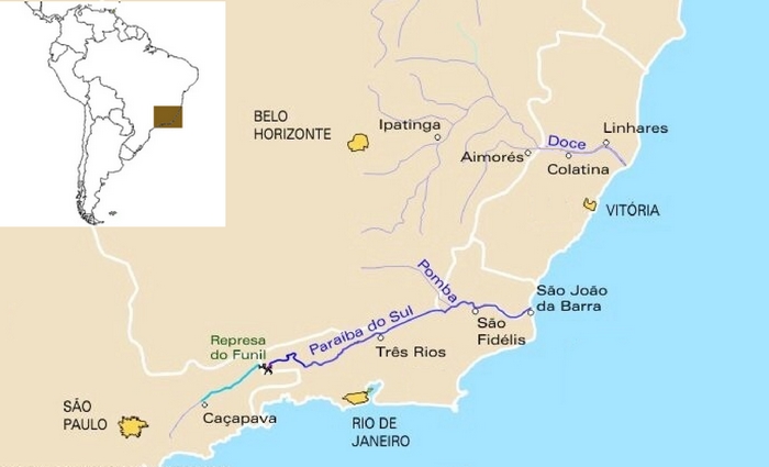 Scénario tout à fait différent au Brésil où des bancs de danios fluos ont été repérés, en 2015, dans le bassin versant de la rivière Paraíba do Sul, près de Muriaé (cf carte), là où se trouvent de très nombreuses fermes aquacoles ornementales. On y trouve en effet 4 500 bassins d’élevage, la plupart sans système efficace pouvant empêcher la fuite des poissons vers les ruisseaux d’alimentation très proches (de un à cinq mètres).