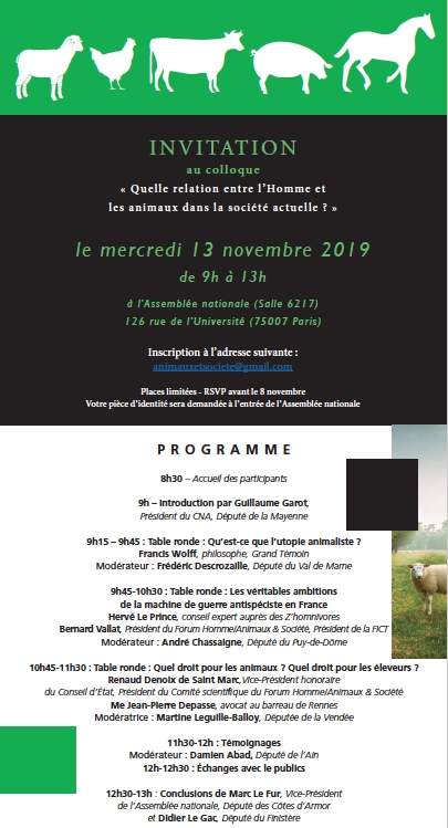 A noter que le Forum Homme Animaux & Société co-organise un colloque intitulé « Quelle relation entre l’Homme et les animaux dans la société actuelle ? » à l'Assemblée nationale le 13 novembre prochain, sous l'impulsion de Marc le Fur, Vice-Président de l'Assemblée nationale, député des Côtes-d'Armor et Didier le Gac, député du Finistère.